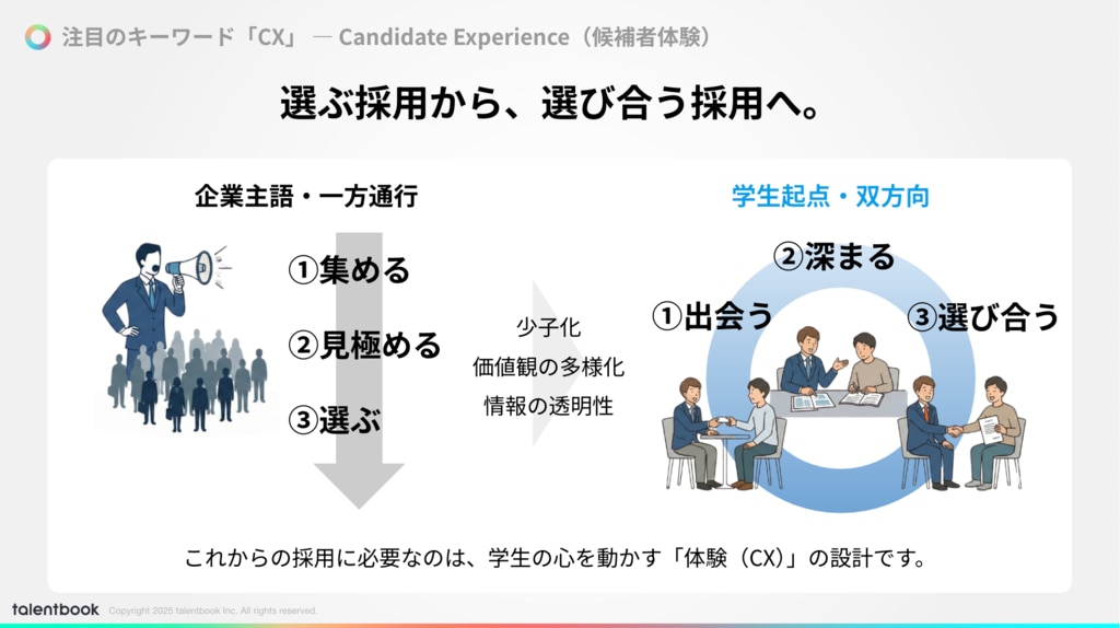 これからの新卒採用は「候補者起点・双方向」です。企業と学生が互いにパートナーとして向き合い、出会い、理解を深め、納得して選び合う。この候補者体験(CX)を実現するのが、ロールモデルを軸にした採用戦略です。