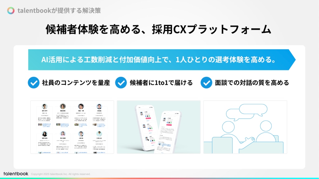 採用の3ステップ「出会う→深まる→選び合う」を一貫して支えるのが、talentbookが提供する3つの機能です。