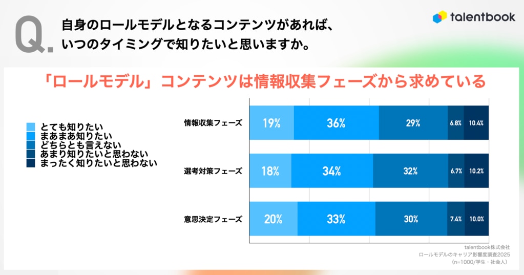 興味深いのは、情報収集だけでなく、選考対策フェーズ、意思決定フェーズのすべてにおいて、ロールモデル情報へのニーズが高いという点です。